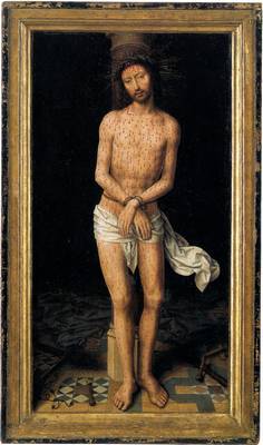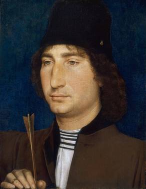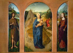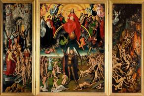 Born in Seligenstadt, near Frankfurt in the Middle Main region, Memling served his apprenticeship at Mainz or Cologne, and later worked in the Low Countries under Rogier van der Weyden (c. 1455–1460) in Brussels, Duchy of Brabant. He then worked at Bruges, County of Flanders by 1465.Last Judgement, triptych, oil on wood, 1466–1473. National Museum, GdańskHe may have been wounded at the Battle of Nancy (1477), sheltered and cured by the Hospitallers at Bruges and to show his gratitude he refused payment for a picture he had painted for them. Memling did paint for the Hospitallers in 1479 and 1480, and it is likely that he was known to the patrons of St John prior to the Battle of Nancy. In 1477, when he was believed dead, he was under contract to create an altarpiece for the gild-chapel of the booksellers of Bruges. This altarpiece, Scenes of the Passion of Christ, now in the Galleria Sabauda of Turin, is not inferior in any way to those of 1479 in the Hospital of St. John, which for their part are hardly less interesting as illustrative of the master's power than The Last Judgment, which since the 1470s, is in the National Museum, Gdańsk. Critical opinion has been generally unanimous in assigning this altarpiece to Memling. This is evidence that Memling was a resident of Bruges in 1473; for the Last Judgment was likely painted and sold to a merchant at Bruges, who shipped it there on board a vessel bound to the Mediterranean which was captured by Danzig privateer Paul Beneke in that very year. The purchase of his pictures by an agent of the Medici demonstrates that he had a considerable reputation.The oldest allusions to pictures connected to Memling point to his relations with the Burgundian court, which was held in Brussels. The inventories of Margaret of Austria, drawn up in 1524, allude to a triptych of the God of Pity by Rogier van der Weyden, of which the wings containing angels were painted by 'Master Hans'. He may have been apprenticed to van der Weyden in Bruges, where he afterwards dwelt.The clearest evidence of the connection of the two masters is that afforded by pictures, particularly an altarpiece, which has alternately been assigned to each of them, and which may be due to their joint labours. In this altarpiece, which is a triptych ordered for a patron of the house of Sforza, we find the style of van der Weyden in the central panel of the Crucifixion, and that of Memling in the episodes on the wings. Yet the whole piece was assigned to the former in the Zambeccari collection at Bologna, whilst it was attributed to the latter at the Middleton sale in London in 1872.Memling`s painting of the Baptist in the gallery of Munich (c. 1470) is the oldest form in which Memling's style is displayed. The subsequent Last Judgment in Gdańsk shows that Memling preserved the tradition of sacred art used earlier by Rogier van der Weyden in the Beaune Altarpiece.Memling`s portraits, in particular, were popular in Italy. According to Paula Nuttall, Memling's distinctive contribution to portraiture was his use of landscape backgrounds, characterized by 'a balanced counterpoint between top and bottom, foreground and background: the head offset by the neutral expanse of sky, and the neutral area of the shoulders enlivened by the landscape detail beyond'. Memling`s portrait style influenced the work of numerous late-15th-century Italian painters, and is evident in works such as Raphael's Portraits of Agnolo and Maddalena Doni. He was popular with Italian customers as shown in the preference given to them by such purchasers as Cardinal Grimani and Cardinal Bembo at Venice, and the heads of the house of Medici at Florence.Triptych of Earthly Vanity and Divine Salvation (front) (c.1485)Oil on oak panel, 22 x 15 cm (each wing) Musée des Beaux-Arts de StrasbourgMemling's reputation was not confined to Italy or Flanders. The Madonna and Saints (which passed from the Duchatel collection to the Louvre), the Virgin and Child (painted for Sir John Donne and now at the National Gallery, London), and the four attributed portraits in the Uffizi Gallery of Florence (including the Portrait of Folco Portinari), show that his work was widely appreciated in the 16th century.The Scenes from the Passion of Christ in the Galleria Sabauda of Turin and the Advent and Triumph of Christ in the Pinakothek of Munich are illustrations of the habit in Flanders art of representing a cycle of subjects on the different planes of a single picture, where a wide expanse of ground is covered with incidents from the Passion in the form common to the action of sacred plays.Memling became sufficiently prosperous that his name appears on a list of the 875 richest citizens of Bruges who were obligatory subscribers to the loan raised by Maximilian I of Austria, to finance hostilities towards France in 1480. Memling`s name does not appear on subsequent subscription lists of this type, suggesting that his financial circumstances declined somewhat as a result of the economic crisis in Bruges during the 1480s.The masterpiece of Memling`s later years, the Shrine of St Ursula in the museum of the hospital of Bruges, is fairly supposed to have been ordered and finished in 1480. The delicacy of finish in its miniature figures, the variety of its landscapes and costume, the marvellous patience with which its details are given, are all matters of enjoyment to the spectator. There is later work of the master in the St Christopher and Saints of 1484 in the academy, or the Newenhoven Madonna in the hospital of Bruges, or a large Crucifixion, with scenes from the Passion, of 1491 from the Lübeck Cathedral (Dom) of Lübeck, now in Lübeck`s St. Annen Museum. Near the close of Memling`s career he was increasingly supported by his workshop. The registers of the painters` guild at Bruges give the names of two apprentices who served their time with Memling and paid dues on admission to the guild in 1480 and 1486. These subordinates remained obsc
