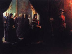 Nikolai Nikolaevich Ge (1831 – 1894) was a Russian realist painter famous for his works on historical and religious motifs.Nikolai Ge was born in Voronezh City, to a Russian noble family of French origin. His grandfather emigrated to Russia in the 18th century. His parents died when he was still a child, so Nikolai was raised by his serf nurse. He graduated from the First Kiev Gymnasium and studied at the physics-mathematics department of Kiev University and Saint Petersburg University.In 1850 he gave up his career in science and entered the Imperial Academy of Arts in Saint Petersburg. He studied in academy under the historical painter Pyotr Basin until 1857. He graduated from the academy in 1857 with a gold medal for his painting The Witch of Endor Calling Up the Spirit of the Prophet Samuel. According to Ge himself, during that period he was strongly influenced by Karl Briullov.His gold medal provided him a scholarship for studying abroad . He visited Germany, Switzerland, France and in 1860 settled in Italy. In Rome he met Alexander Andreyevich Ivanov who strongly influenced Ge.In 1861 Ge painted The Last Supper; using the image for his central figure of Christ a photograph taken by Russian photographer Count Sergei Lvovich Levitsky (1819–1898) of Levitsky's cousin Aleksandr Ivanovich Herzen (1812–1870); the pro-Western writer and outstanding public figure.It is the first time photography became the main starting point for the solution to a central character of a painting and speaks to the deep influences that photography would have later on in art and movements like French Impressionism.The painting (bought by Tsar Alexander II of Russia) made such a strong impression when it was shown in Saint Petersburg in 1863 that Ge was made a professor of Imperial Academy of Arts.In 1864 Ge returned to Florence and would paint not only Herzen's portrait but also the Messengers of the Resurrection and the first version of the Christ on the Mount of Olives. The new religious paintings at that time were not much of a success, and the Imperial Academy refused to exhibit them in its annual exhibition.In 1870 Ge again returned to Saint Petersburg there he turned to Russian history for subject matter. The painting Peter the Great Interrogates Tsarevich Alexey at Peterhof (1871) was a great success, but other historical paintings were met without interest. Ge took the cold response to his work very hard. He wrote that a man should live by doing agricultural work, and the art should not be for sale. He bought a small khutor (farm) in Chernigov gubernia (currently Ukraine) and moved there. He became acquainted with Leo Tolstoy and became an enthusiastic follower of his philosophy.In the early 1880s he returned to art producing religious paintings and portraits. He stated that everybody has a right to have a portrait so he agreed to work for whatever low commission the subject could afford. Among his portraits of the time was his famous portrait of Leo Tolstoy, portrait of Mikhail Saltykov-Shchedrin and many others.His late paintings on New Testament subjects of that period were praised by liberal critics like Vladimir Stasov, criticized by conservatives as illustrating Ernest Renan rather than the New Testament and forbidden by the authorities for blasphemy. Quod Est Veritas? Christ and Pilate (1890) was expelled from the exhibition; The Judgment of the Sanhedrin: He is Guilty! (1892) was not admitted to the annual Academy of Arts exhibition; The Calvary (Golgotha) (1893) remained unfinished; The Crucifixion (1894) was banned by Tsar Alexander III.Ge died on his farm in 1894. |  |