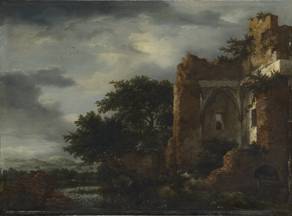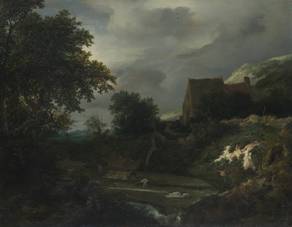 A Rocky Hill with Three Cottages, a Stream at its Foot