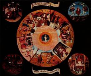 Hieronymus Bosch was a European painter of the late Middle Ages. His two most famous works are The Garden of Earthly Delights and The Temptation of St. Anthony. Born in `s-Hertogenbosch, Brabant (now in the Netherlands), around 1450. His work utilizes striking and sometimes seemingly surreal iconography. Throughout his career, he used his art to portray the sins and follies of humankind and to show the consequences of these actions. He died in `s-Hertogenbosch in 1516. Known for his dark and disturbing visions, Bosch took a critical look at the world around in several of his works. Throughout his career, Bosch focused much of his attention to exploring religious themes. The Haywain a triptych, first shows Adam and Eve in its interior left panel. The center panel features both clergy and peasants engaged in sinful behavior. The right panel provides a gruesome illustration of where that type of behavior leads—hell. While he enjoyed some success during his lifetime, he attracted an even grander fan soon after his death. King Philip II of Spain became a serious collector of Bosch`s work, and The Garden of Earthly Delight is said to have been hung in his bedroom to remind the Spanish monarch to stay on a righteous path. | ![]() |