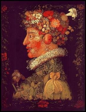 Arcimboldo is known as a 16th-century Mannerist. A transitional period from 1520 to 1590, Mannerism adopted some artistic elements from the High Renaissance and influenced other elements in the Baroque period. A Mannerist tended to show close relationships between human and nature. Arcimboldo also tried to show his appreciation of nature through his portraits. In The Spring, the human portrait was composed of only various spring flowers and plants. From the hat to the neck, every part of the portrait, even the lips and nose, was composed of flowers, while the body was composed of plants. On the other hand, in The Winter, the human was composed mostly of roots of trees. Some leaves from evergreen trees and the branches of other trees became hair, while a straw mat became the costume of the human portrait. |  |