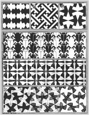Dutch graphic artist who made mathematically inspired woodcuts, lithographs, and mezzotints. Early in his career he drew inspiration from nature, making studies of insects, landscapes, and plants such as lichens, all of which he reused as details in his artworks. He travelled in Italy and Spain, sketching buildings, townscapes, architecture and the tilings of the Alhambra and La Mezquita, Cordoba, and became steadily more interested in their mathematical structure. His work features mathematical objects and operations including impossible objects, explorations of infinity, reflection, symmetry, perspective, truncated and stellated polyhedra, hyperbolic geometry, and tessellations. Although Escher considered that he had no mathematical ability, he interacted with mathematicians George Pólya, Roger Penrose, and Harold Coxeter; read mathematical papers by these authors and by the crystallographer Friedrich Haag; and conducted his own original research into tessellation. | ![]() |