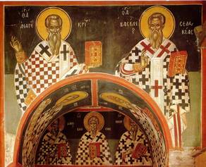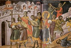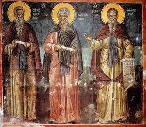 Theophanes was born in the capital of the Byzantine Empire, Constantinople. After studying Art and philosophy at the University of Constantinople, he moved to Novgorod in 1370, and in 1395 to Moscow. His style is considered unsurpassed in expression achieved by almost mono-colored painting. Some of his contemporaries observed that he appeared to be painting with a broom in reference to the bold, broad execution in some of his finest frescos (see St. Makarios of Egypt), which are unique in the larger Byzantine tradition. Theophanes was described by the Muscovites as learned in philosophy, a reflection on his broad education and erudition. A hint of this might be gathered from his panel icon of the Transfiguration of Jesus, where the arresting geometry and brilliance of the figure of Christ is balanced against the ordered disarray of the earthbound Apostles, strewn about doll-like in the uncreated Light of Mount Tabor. The balance of mathematical harmony in line and shape, wed to a master`s use of an earthtone palette and precious gold leaf, evokes a spirituality that is immensely powerful, and speaks to the genius of this relatively unknown painter. |  |