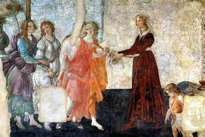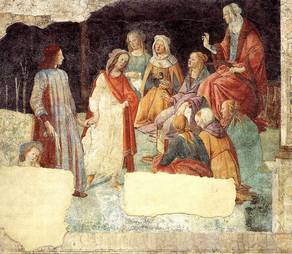 In the mid-1480s, Botticelli worked on a major fresco cycle with Perugino, Domenico Ghirlandaio and Filippino Lippi, for Lorenzo the Magnificent`s villa near Volterra; in addition he painted many frescoes in Florentine churches. In 1491 he served on a committee to decide upon a façade for the Cathedral of Florence. |