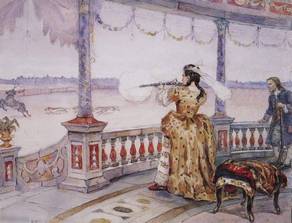 In 1877, Surikov settled in Moscow, where he contributed some imposing frescoes to the Cathedral of Christ the Savior. In 1878 he married Elizabeth Charais, a granddaughter of the Decembrist Svistunov. In 1881 he joined the Peredvizhniki movement. From 1893 he was a full member of the St.Petersburg Academy of Arts. Surikov was interred at the Vagankovskoye Cemetery in Moscow. |