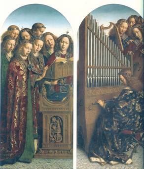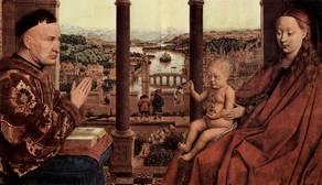 Van Eyck painted both secular and religious subject matter, including commissioned portraits, donor portraits (with the donor kneeling before a seated Virgin Mary) and both large and portable altarpieces. He worked on panel, either as single panels, diptych, triptychs, or polyptychs. He was well paid by Philip, who sought that the painter was secure financially and thus had artistic freedom and could paint whenever he pleased. His work comes from the International Gothic style, but he soon eclipsed it, in part through a greater emphasis on naturalism and realism. Van Eyck utilised a new level of virtuosity, mainly through the use of oil as a medium; the fact that oil dries so slowly allowed him more time and more scope for blending and mixing layers of different pigments. He was highly influential and his techniques and style were quickly adopted and refined by Robert Campin and Rogier van der Weyden and later generations of Early Netherlandish painters. |  |