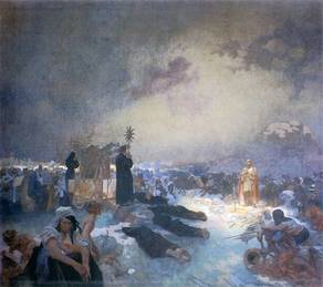 Mucha`s style was given international exposure by the 1900 Universal Exhibition in Paris, of which Mucha said, I think made some contribution toward bringing aesthetic values into arts and crafts. He decorated the Bosnia and Herzegovina Pavilion and collaborated with decorating the Austrian Pavilion. His Art Nouveau style was often imitated. The Art Nouveau style however, was one that Mucha attempted to disassociate himself from throughout his life; he always insisted that rather than maintaining any fashionable stylistic form, his paintings were entirely a product of himself and Czech art. He declared that art existed only to communicate a spiritual message, and nothing more; hence his frustration at the fame he gained by his commercial art, when he most wanted to concentrate on more artistic projects. |  |