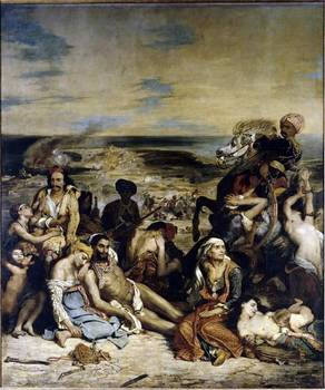 Delacroix`s painting of the massacre at Chios shows sick, dying Greek civilians about to be slaughtered by the Turks. One of several paintings he made of this contemporary event, it expresses sympathy for the Greek cause in their war of independence against the Turks, a popular sentiment at the time for the French people. Delacroix was quickly recognized as a leading painter in the new Romantic style, and the picture was bought by the state. His depiction of suffering was controversial however, as there was no glorious event taking place, no patriots raising their swords in valour as in David`s Oath of the Horatii, only a disaster. Many critics deplored the painting`s despairing tone; the artist Antoine-Jean Gros called it "a massacre of art". The pathos in the depiction of an infant clutching its dead mother`s breast had an especially powerful effect, although this detail was condemned as unfit for art by Delacroix`s critics. A viewing of the paintings of John Constable and the watercolour sketches and art of Richard Parkes Bonnington prompted Delacroix to make extensive, freely painted changes to the sky and distant landscape.