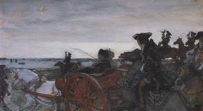 Serov`s democratic beliefs were clearly shown during the Revolution from 1905 to 1907: he depicted a number of satirical figures exposing chastisers. A full member of the St.Petersburg Academy of Arts since 1903, in 1905 he resigned as a gesture of protest against the execution of striking workers and their families on 9 January, Bloody Sunday. His late creativity found expression in historical painting (Peter II departure and Empress Elizabeth Petrovna on hunting, 1900, Russian Museum), and depth of comprehension of the historical maintenance of an epoch (Peter I, distemper, 1907, Tretyakov Gallery).