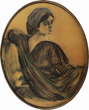 During his late period, which began in 1900, Serov was a member of "The World of art", an influential Russian art association and magazine which grew, in part, out of dissatisfaction with the Itinerants movement. At the start of the 20th century, Serov was at a stylistic turning point: features of impressionism disappeared from his work, and his modernistic style developed, but the characteristic truthful and realistic comprehension of the nature of his subjects remained constant. In the early 20th century Serov created heroic portrait images; within the genre of the fashionable portrait, Serov focused on the dramatic depiction of creative artists, writers, actors, and musicians of import: Maxim Gorki`s portraits (1904), A.M. Gorki`s museum, Moscow; Maria Yermolova (1905), Feodor Chaliapin (charcoal, 1905) - both in the Tretyakov Gallery, and Helena Roerich (1909).