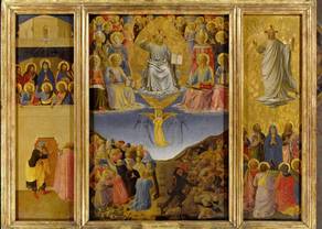 From 1408 to 1418 Fra Angelico was at the Dominican friary of Cortona where he painted frescoes, now destroyed, in the Dominican Church and may have been assistant to or follower of Gherardo Starnina. Between 1418 and 1436 he was at the convent of Fiesole where he also executed a number of frescoes for the church, and the Altarpiece, deteriorated but restored. A predella of the Altarpiece remains intact in the National Gallery, London which is a superb example of Fra Angelico`s ability. It shows Christ in Glory, surrounded by more than 250 figures, including beatified Dominicans.