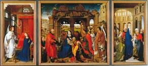 Van der Weyden worked from life models, and his observations were acute, yet he often idealised certain elements of his models` facial features, and they are typically statuesque, especially in his triptychs. All of his forms are rendered with rich, warm colourisation and a sympathetic expression, while he is known for his expressive pathos and naturalism. His portraits tend to be half length and half profile, and he is as sympathetic here as in his religious triptychs. Van der Weyden used an unusually broad range of colours and varied tones; in his finest work the same tone is not repeated in any other area of the canvas; even the whites are varied. |  |