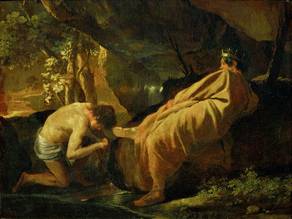 In 1642, disgusted by the intrigues of Simon Vouet, Fouquieres and the architect Jacques Lemercier, Poussin withdrew to Rome. There, in 1648, he finished for de Chantelou the second series of the Seven Sacraments (Bridgewater Gallery), and also his noble Landscape with Diogenes (Louvre). This painting shows the philosopher discarding his last worldly possession, his cup, after watching a man drink water by cupping his hands. In 1649 he painted the Vision of St Paul (Louvre) for the comic poet Paul Scarron, and in 1651 the Holy Family (Louvre) for the duc de Crequy. Year by year he continued to produce an enormous variety of works, many of which are included in the list given by Felibien.