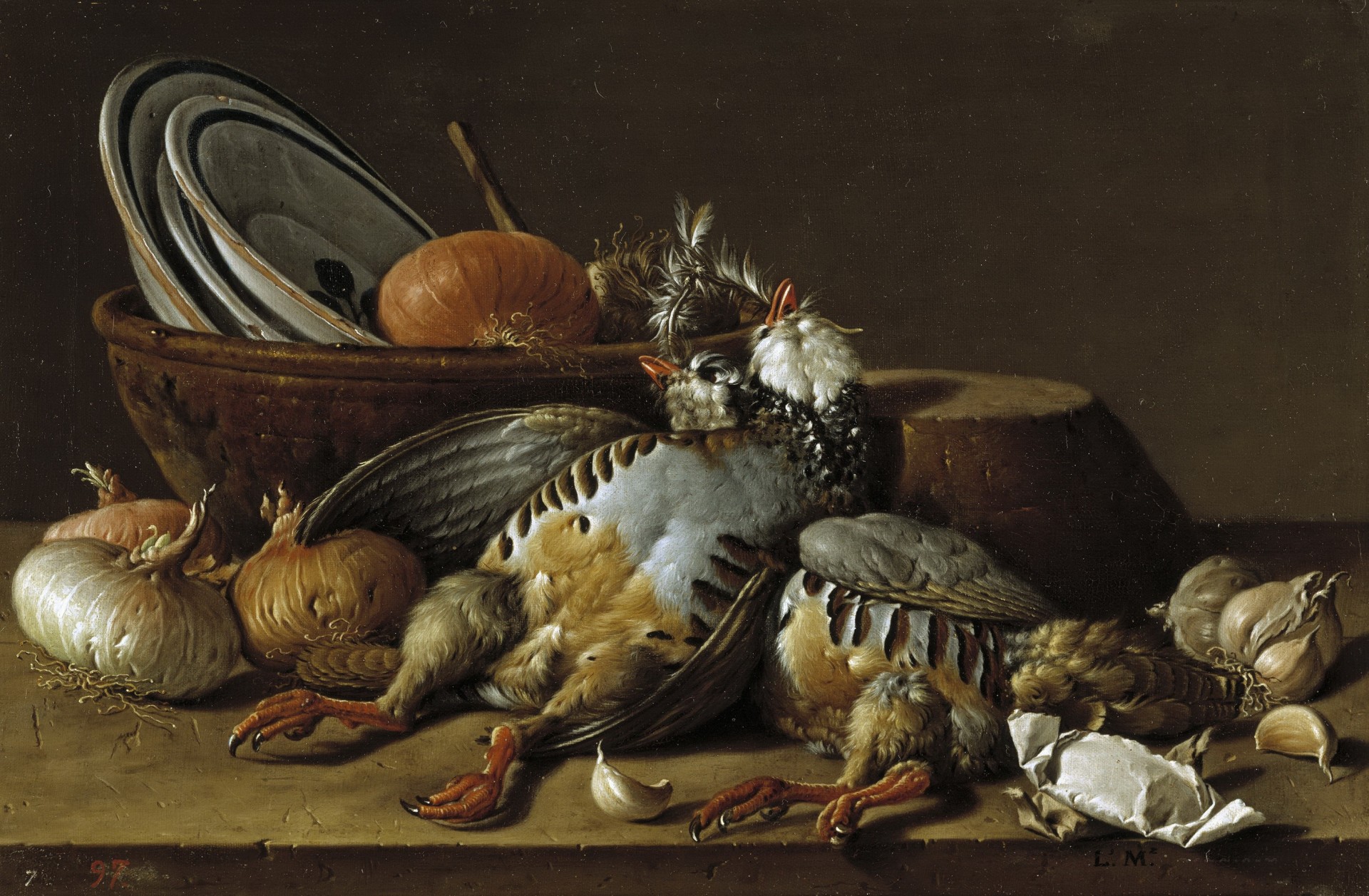 Natyurmort s dvumya kuropatkami, lukom, chesnokom i sosudami, 41,6 sm x 62,3 sm, holst, maslo