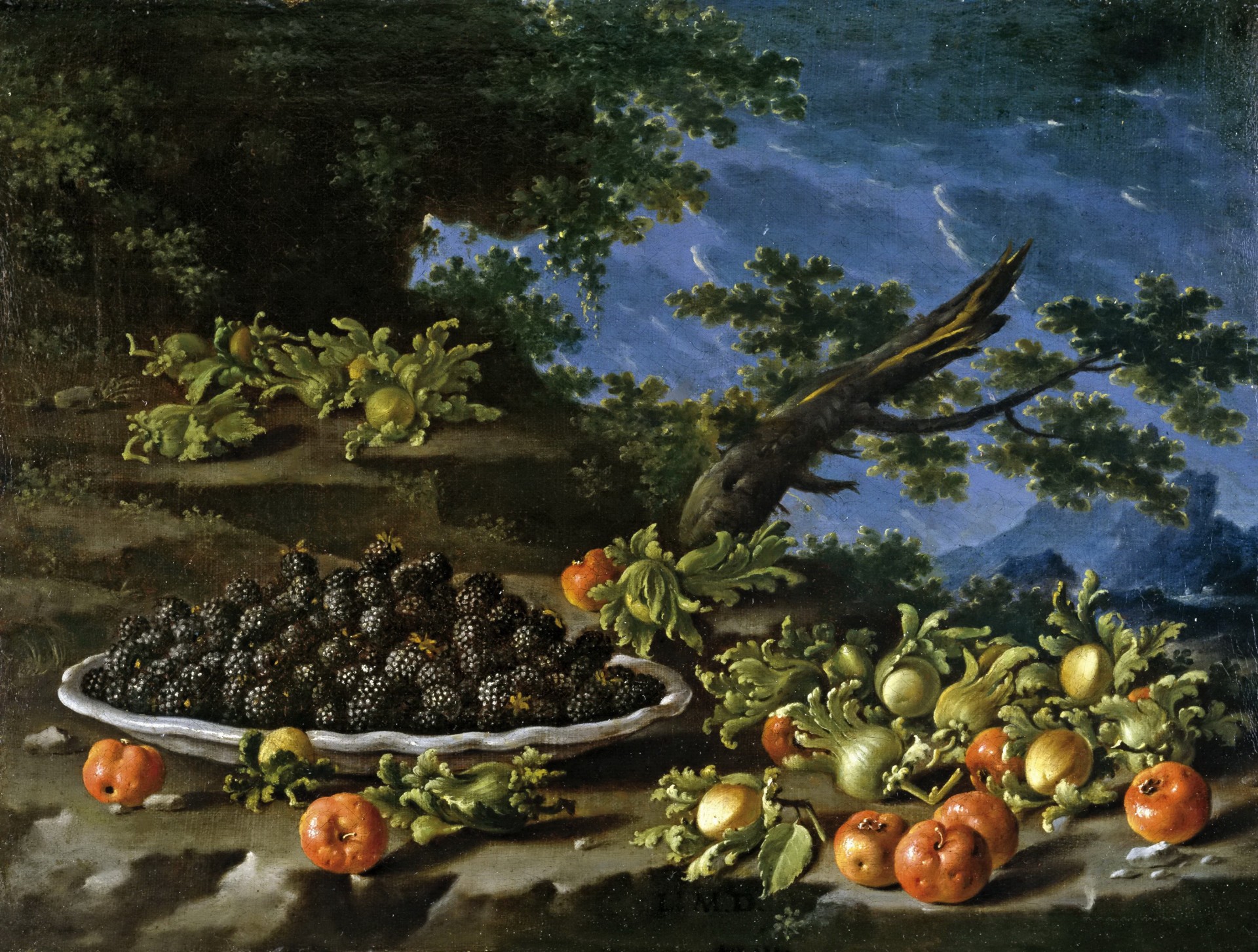 Natyurmort s yagodami Aceroli vishni i orehi v peyzazhe, Siglo XVIII, 37 sm x 49 sm, holst, maslo