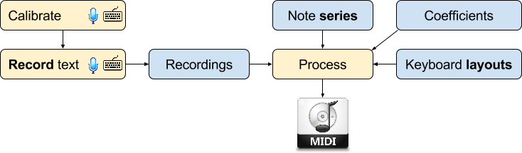 This project uses microphone to measure velocity (volume) of keypresses. Microphone should be close to keyboard or integrated into your notebook. You can use microphone to sing or produce other noise to control velocity of keypresses during typing.